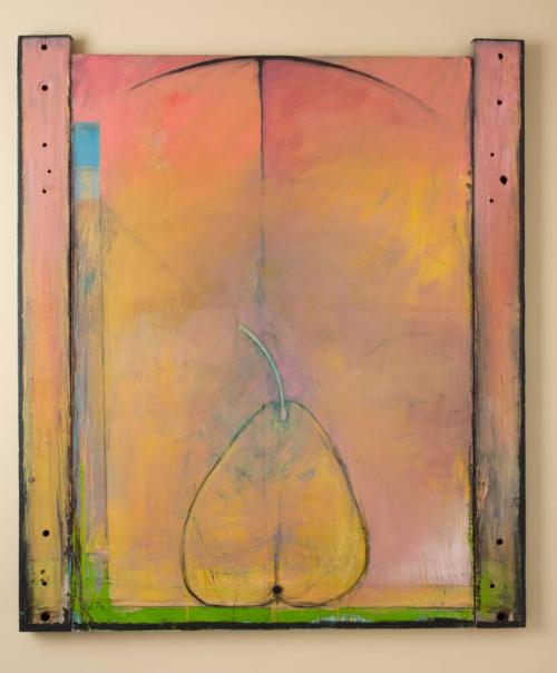 DescriptionPear (1987) is a unique piece that includes the frame as part of the final painted design. Using oil paints on canvas for the center of the piece and blending the frame into the work itself, Brian Bomeisler twists the usual expectations of the physical parts of the painting. Even the work itself, a simple picture of a pear with an arch above it, gives the conceptual edges some foundation in a classical depiction of fruit.The act of painting the frame is not a common one either, with the major artist who worked with them being Georges Seurat, painter of A Sunday Afternoon of the Island of La Grande Jatte. He often extended his compositions onto the frame as Bomeisler does with his painting, Pear.