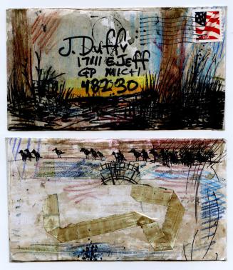 MediumWatercolor, colored pencil, charcoal, marker, adhesive, scraps on envelope; Colored pencil, charcoal, pen on paper; Colored pencil, marker on paper; Marker on paper