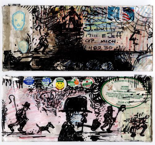 MediumWatercolor, marker, colored pencil, tape, adhesive, scraps on envelope; Marker, colored pencil, charcoal on paper; Marker, colored pencil, charcoal, adhesive, card board, canvas on paper; Colored pencil, charcoal on paper
