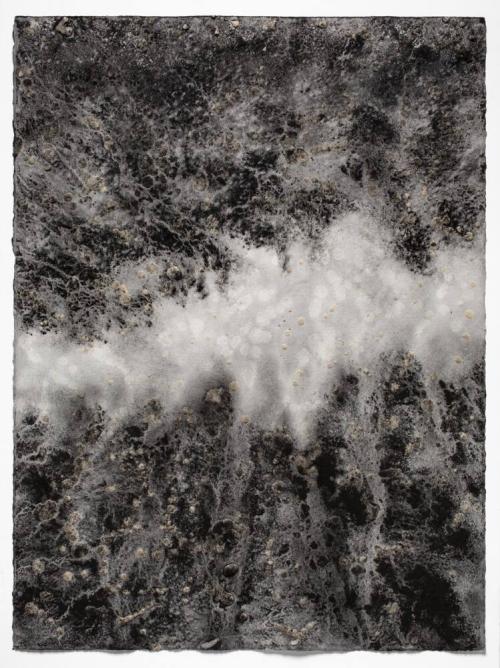 This 2019 untitled drawing is one of three works that is currently on display in Confluent: Detroit Art and the University Art Collection at the Elaine L. Jacob Gallery. As noted previously, each viewer of Weil’s work has a unique and valid experience. When I look at this work, I see an aerial view of trees on the darker top and bottom portions of the composition, with a gray river flowing down the middle. On the other hand, Jones sees more of a celestial image, as she knows that Weil was interested in the genesis of things, like the beginning of the universe; the tactile element of Weil’s homemade rust creates the appearance of a meteor shower. Nevertheless, both our ways of seeing this image are valid and meaningful.