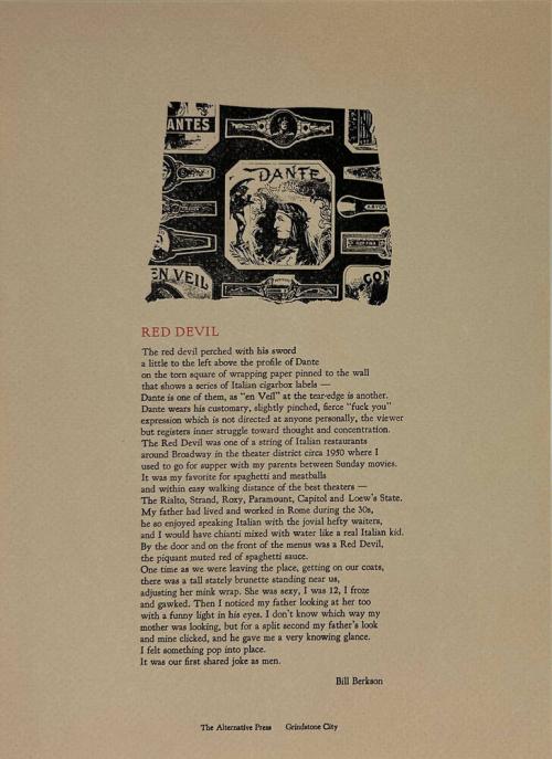DescriptionLetterpress printed poem by Bill Berkson, titled "RED DEVIL". The red devil perched with his sword